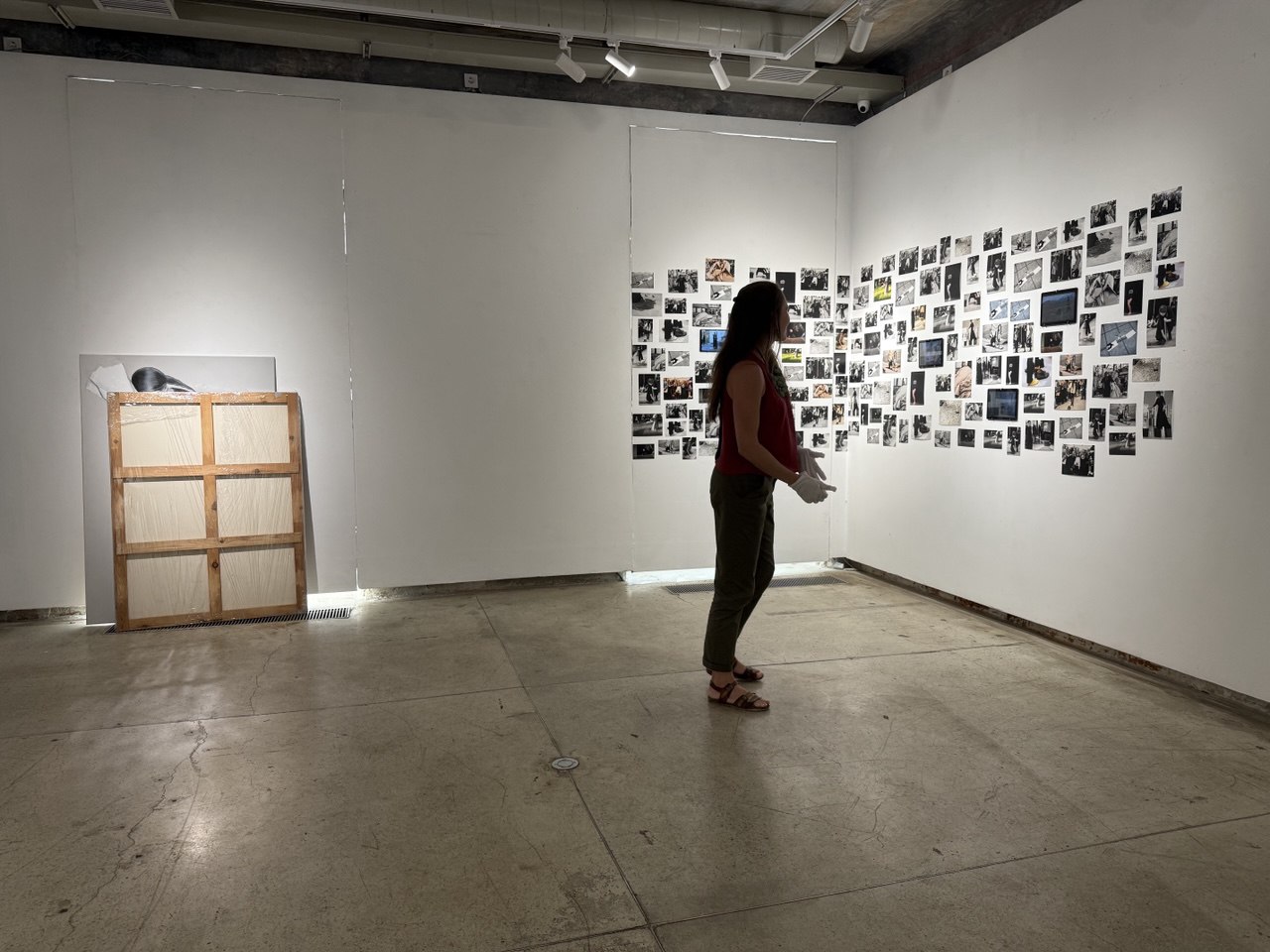 У першій залі праворуч від входу на стіні хмариною скупчилися фотографії та невеликі екрани з відеодокументацією перформансів Ярини Шумської. Мереживоподібний монтаж задає вільну для читання структуру, де зв’язки формуються за принципом співвіднесення – снування між подібними та неподібними знімками без підписів, здебільшого чорно-білих, подекуди кольорових, що варіюються у розмірах, мають вкраплення з рухомим зображенням. Разом вони нагадують про Атлас образів Mnemosyne Абі Варбурга — великі закомпоновані певним чином площини з зображеннями. Кожна площина представляла авторську інтерпретацію історії мистецтва. Варбург не встиг закінчити атлас і додати візуальним розповідям текстовий коментар, натомість встиг відкрити цим всю складність існування образів у часі та просторі. Візуальна хмара у залі муніципального центру на відміну від атласу не містить коментаря за планом, але здається, що мимохіть ставить подібне завдання — дати можливість образам у своєму сплетенні розповісти про перформанси Ярини Шумської.