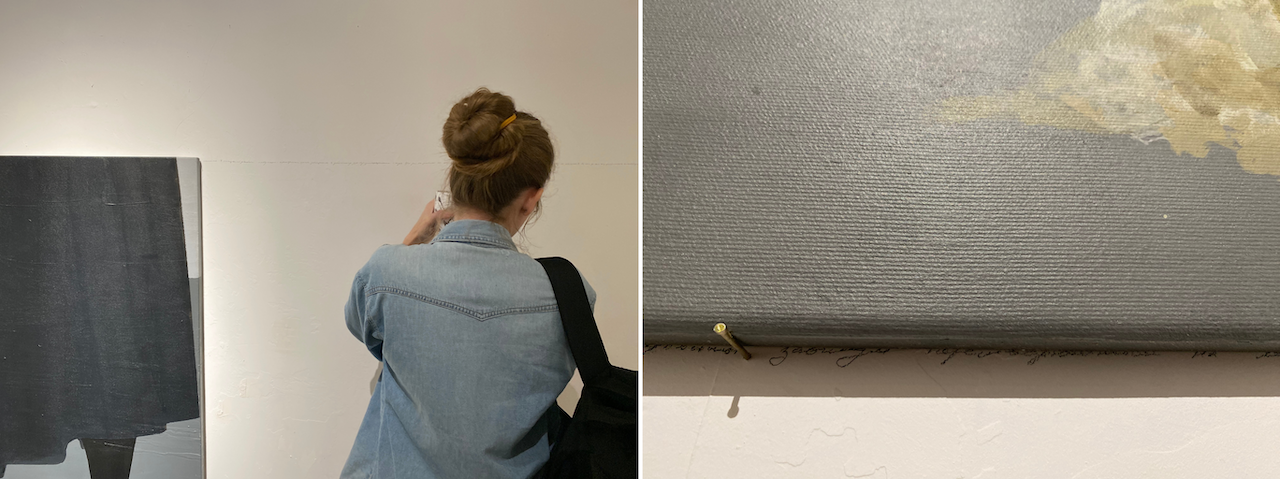 Ця квазі-документація виламувалася з герметичного простору згаданих вже великих живописів. Наче шпарина у стіні, з неї сочилося прохолодне повітря реального світу — та увійти до нього не було жодного шансу. Такий погляд на виставку та пізніші розмови про неї відкрили мені можливу причину цього рішення — хмара спеціально чи не неспеціально вказувала на жагу присутності — вона була епіграфом до проєкту. Чому не вступом? На відміну від вступу, що за мету здебільшого має наперед пояснити ситуацію, епіграфи завжди здавалися мені чимось більш особистісним, сердешним — це напіввідкрита таємниця тексту.