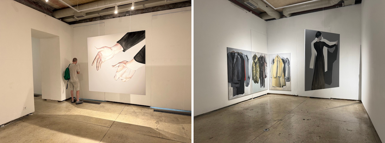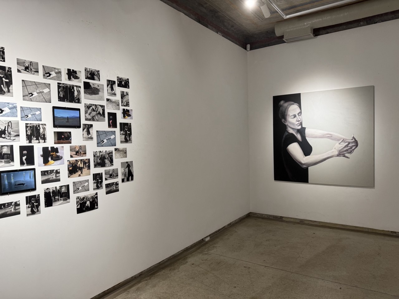 Значною мірою це виставка живописних робіт, але вона включає також інші візуальні та текстуальні елементи. Ледь помітна написана олівцем цівочка слів оперізує другу залу, переривається, наштовхуючись на полотна. Зовні простір виглядає порожнім, але насправді містить розлогий текст, що не має початку і кінця: «…Аритмія, спровокована порушенням сталості. Намагаюсь ще втриматись за відоме мені минуле. Але «тут і тепер» розколихує кожну постать в намацуванні рівноваги майбутнього – еквілібристи, що ніби завмирають у динамічному русі…». Низька контрастність і олівець як матеріал, що легко стирається, створюють ефект стишеного голосу — слова можна почути (прочитати пошепки?) лише зблизька, зосередившись на дії. Текст змушує йти колом уздовж стіни, він не виходить за межі зали й замикається у цикл. Повтори в самому тексті підсилюють це колове відчуття, задаючи глядачеві ритм і рамку досвіду. Вже у цьому спершу непомітному залученні глядача до дії відкривається, що все ж серцем проєкту є інший медіум — перформанс.