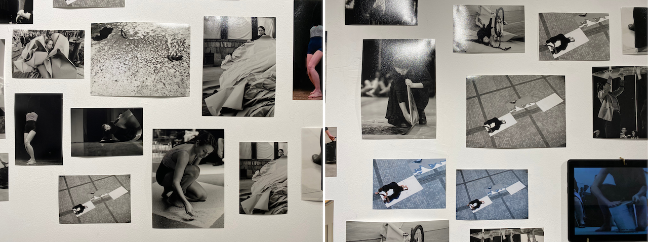 Для себе виокремлюю дві повторювані історії. У першій мисткиня загортається у великий аркуш паперу, притискає його до грудей — і він ховає її на тлі глядацького натовпу. У другій — вона стоїть навколішки на великій, ніби металевій, відблискуючій поверхні, наче збирається вийти з неї. Ракурс згори, з відстані, робить мисткиню самотньою і зосередженою на невідомій мені дії.